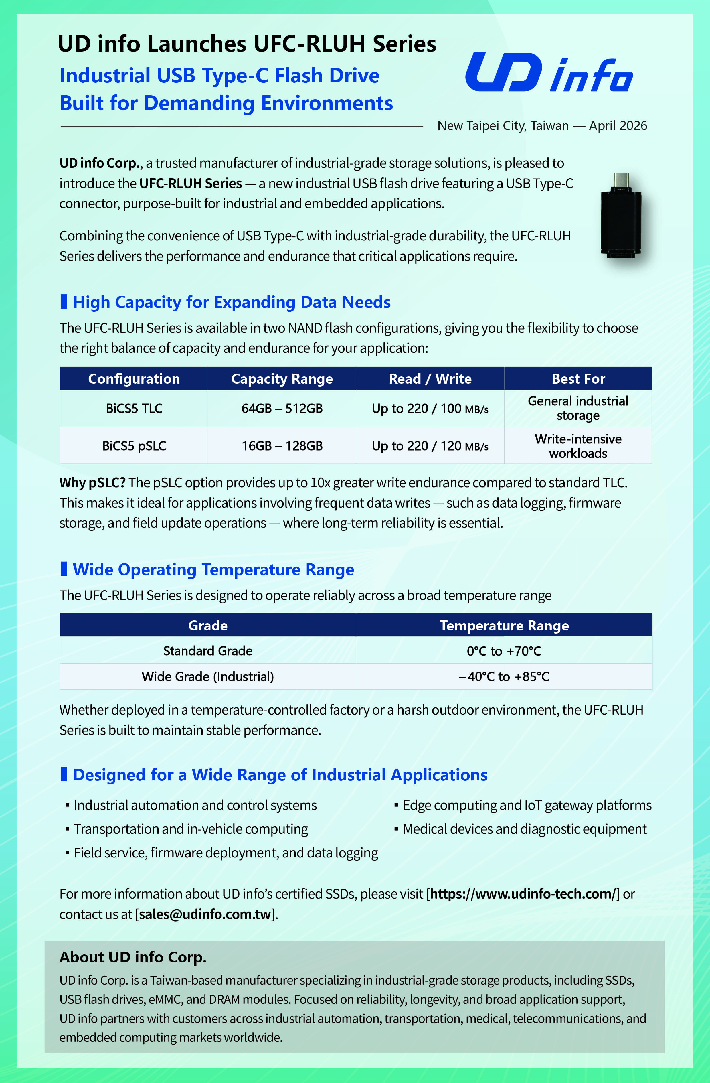 UD info is excited to introduce the UFC-RLUH Series — an industrial USB flash drive featuring a USB Type-C connector,